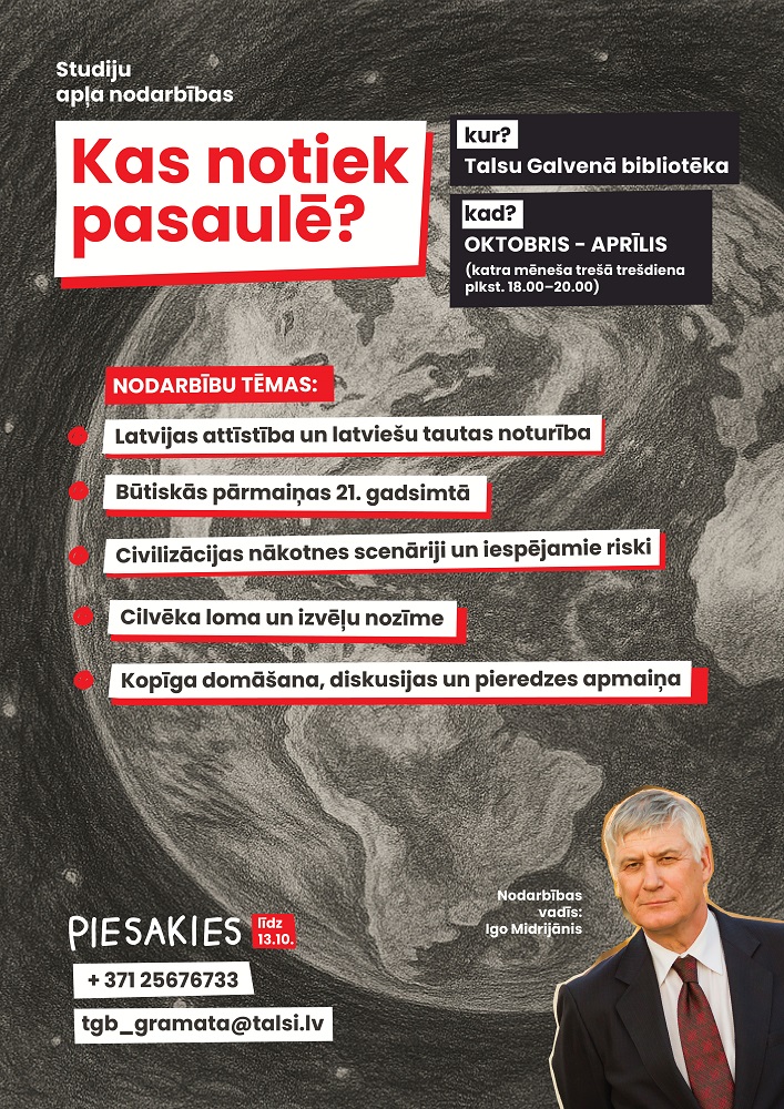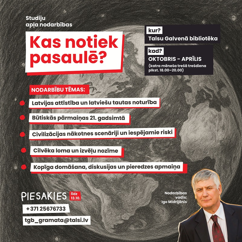 No oktobra līdz aprīlim Talsu Galvenās bibliotēkas telpās notiks bezmaksas studiju apļa nodarbības ,,Kas notiek pasaulē?” par dziļākiem procesiem XXI gadsimtā: par dabas un sociālo likumsakarību pamatojumos balstītām varbūtībām, kādus ienes vēsturiski pagriezieni.