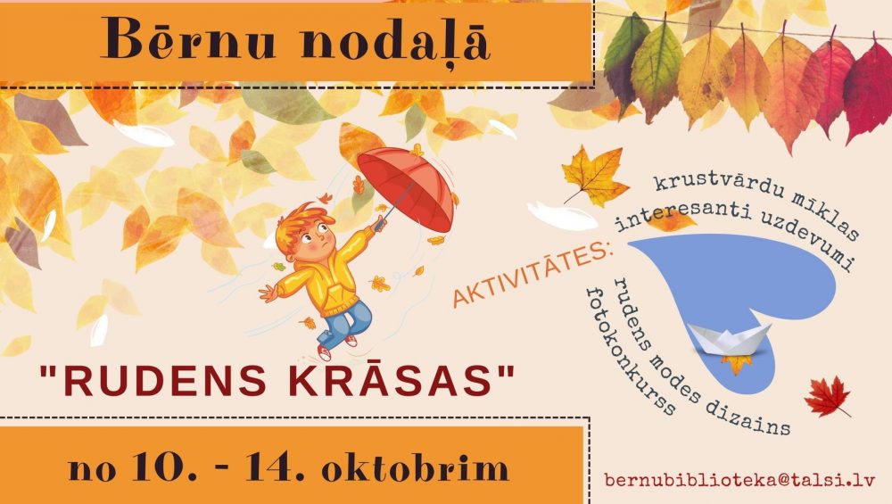 No 10. – 14. oktobrim Talsu Galvenās bibliotēkas Bērnu nodaļa piedāvā aktivitātes “Rudens krāsas”.