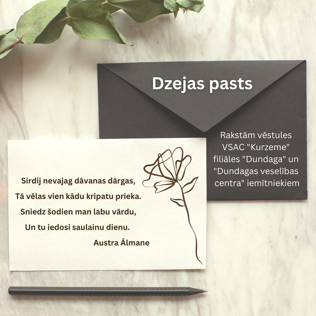 Dundagas bibliotēka aicina iesaistīties kopīgā akcijā “Dzejas pasts” un septembrī rakstīt dzejas vēstules, ar kurām mēneša beigās iepriecināsim valsts sociālās aprūpes centra “Kurzeme” filiāles “Dundaga” un SIA “Dundagas veselības centrs” iemītniekus.