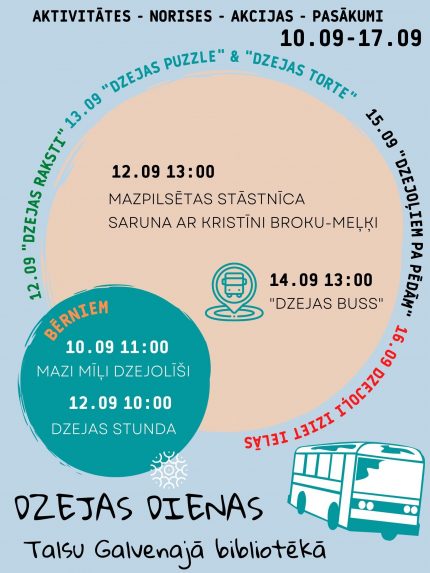 Talsu Galvenā bibliotēka no 10. septembra līdz 17. septembrim piedāvā plašu, Dzejas dienām veltītu, aktivitāšu, akciju un pasākumu klāstu.