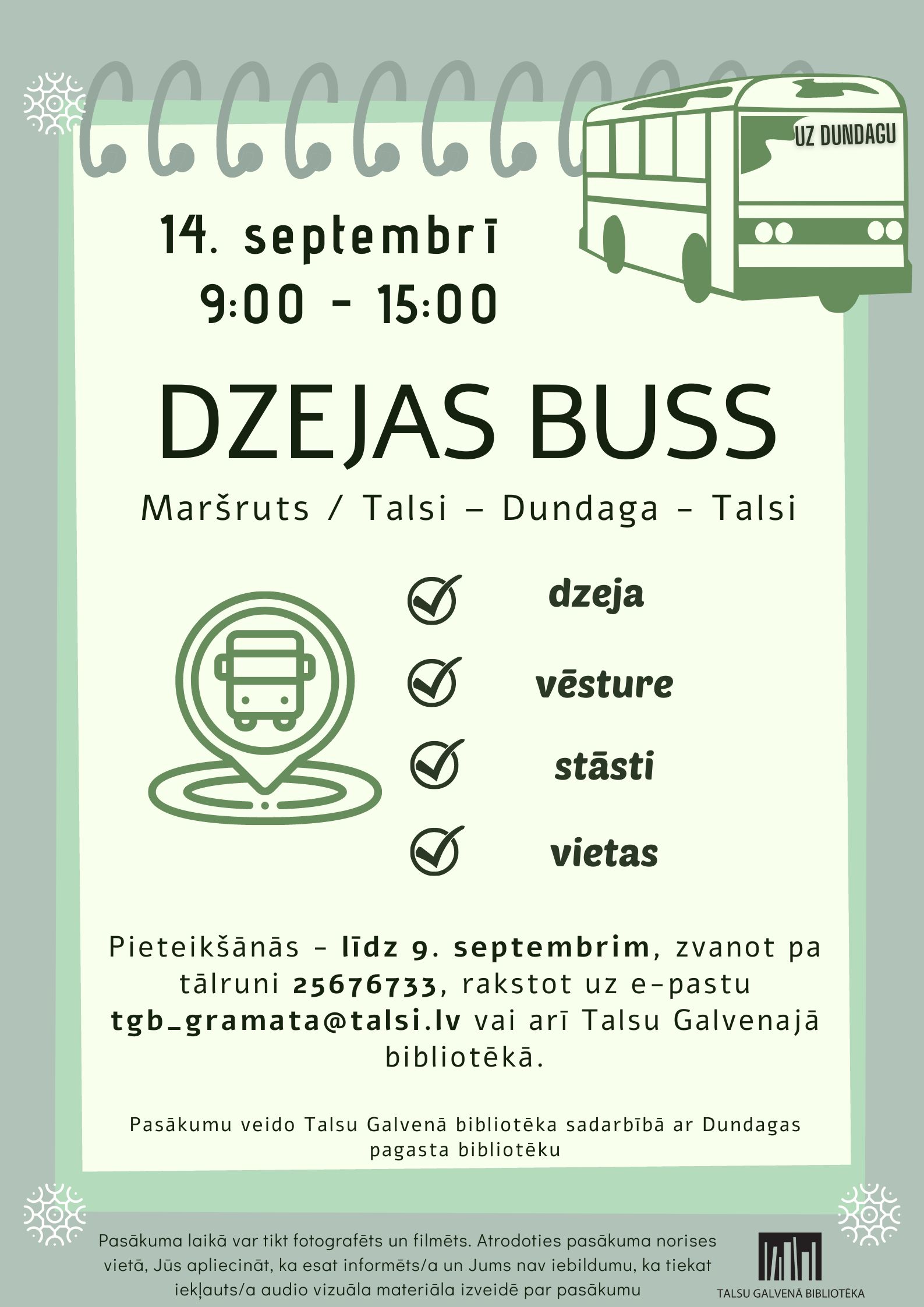 No plkst. 09:00 Talsu Galvenā bibliotēka aicina lasītājus doties ceļojumā ar “Dzejas Busu”. Šoreiz apceļosim Dundagas pusi, sekojot Talsu novadā atstātajām literārajām pēdām un laika nospiedumiem. Maršrutā `Talsi – Dundaga – Talsi` dzejas draugus sagaidīs dzejas lasījumi, dažādas aktivitātes un pārsteigumi, stāsti par vietām un notikumiem.