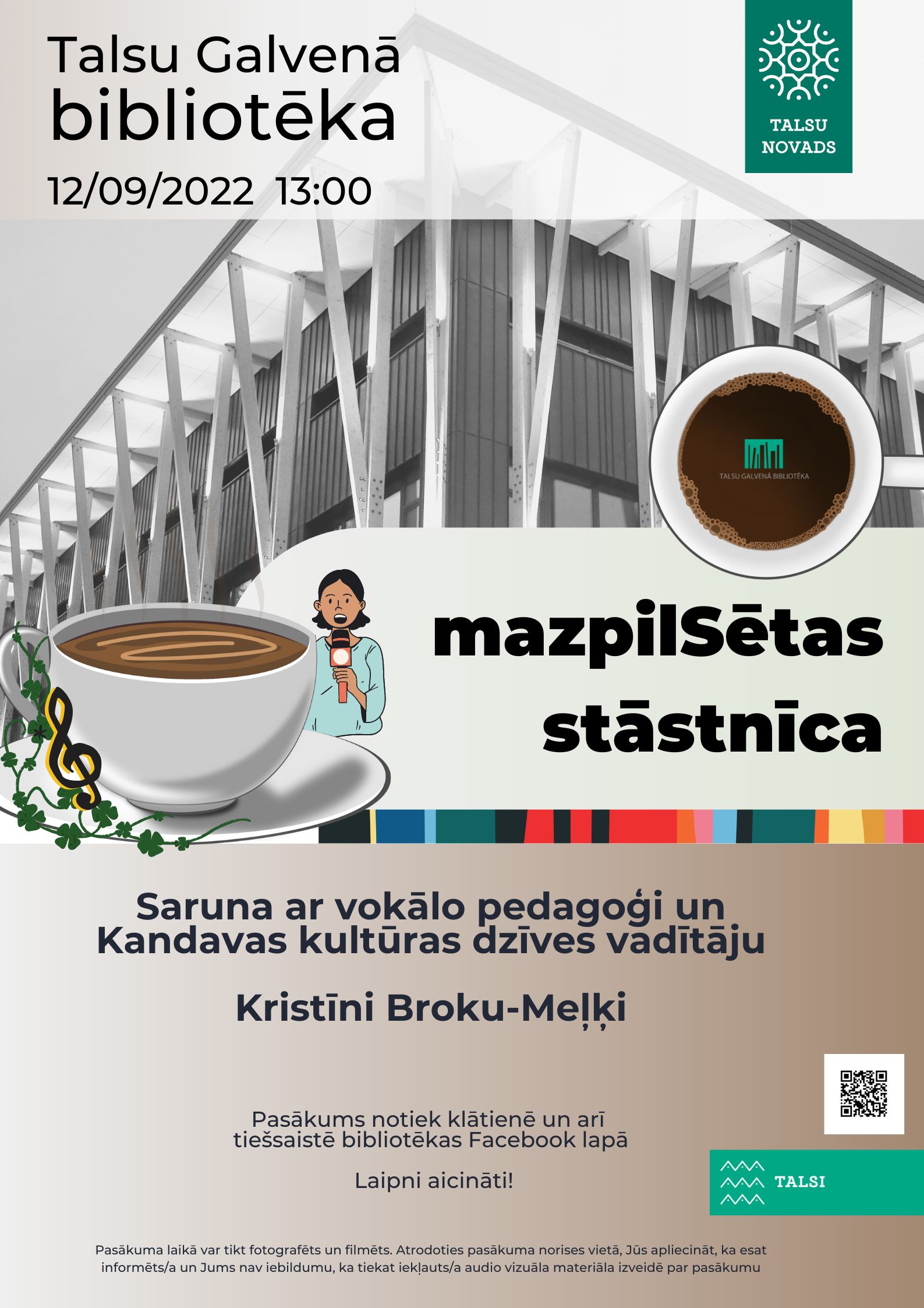 13:00 mazpilSētas stāstnīca – saruna ar vokālo pedagoģi, dziedātāju, Kandavas kultūras dzīves vadītāju Kristīni Broku-Meļķi. Saruna būs skatāma arī tiešraidē bibliotēkas facebook kontā.