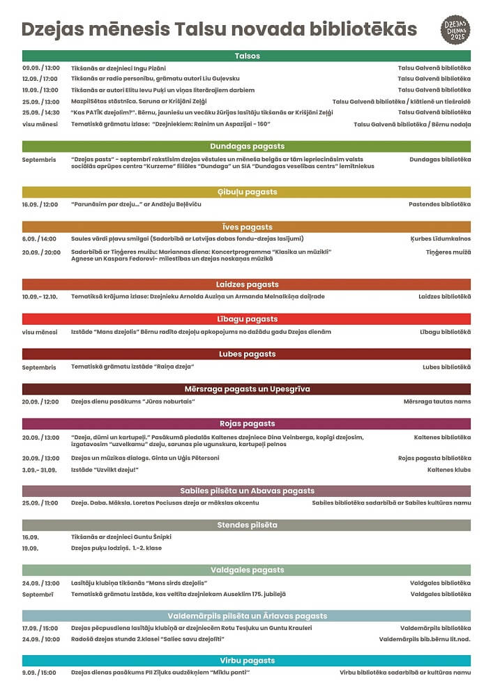 Septembris sākas ar dzeju – aicinām Tevi piedzīvot īpašus brīžus Talsu novada bibliotēkās! Visu mēnesi mūs sagaida pasākumi, tikšanās un radošas aktivitātes, kas veltītas dzejai un tās dažādajām balsīm.