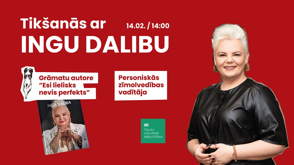 Tikšanās ar Ingu Dalibu Pasākuma apraksts Datums: 14/02/2026 14:00 – 16:00 Vieta: Talsu Galvenā bibliotēka Kategorijas: tikšanās